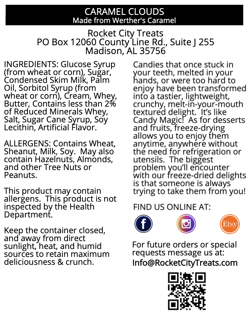 Light as air and packed with flavor, Caramel Clouds offer all the nostalgic comfort of traditional caramels in an exciting new form. Perfect for snacking, dropping a piece into your morning coffee, or adding a touch of whimsy to your day - because sometimes you need to have your head in the clouds!