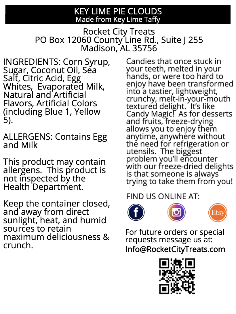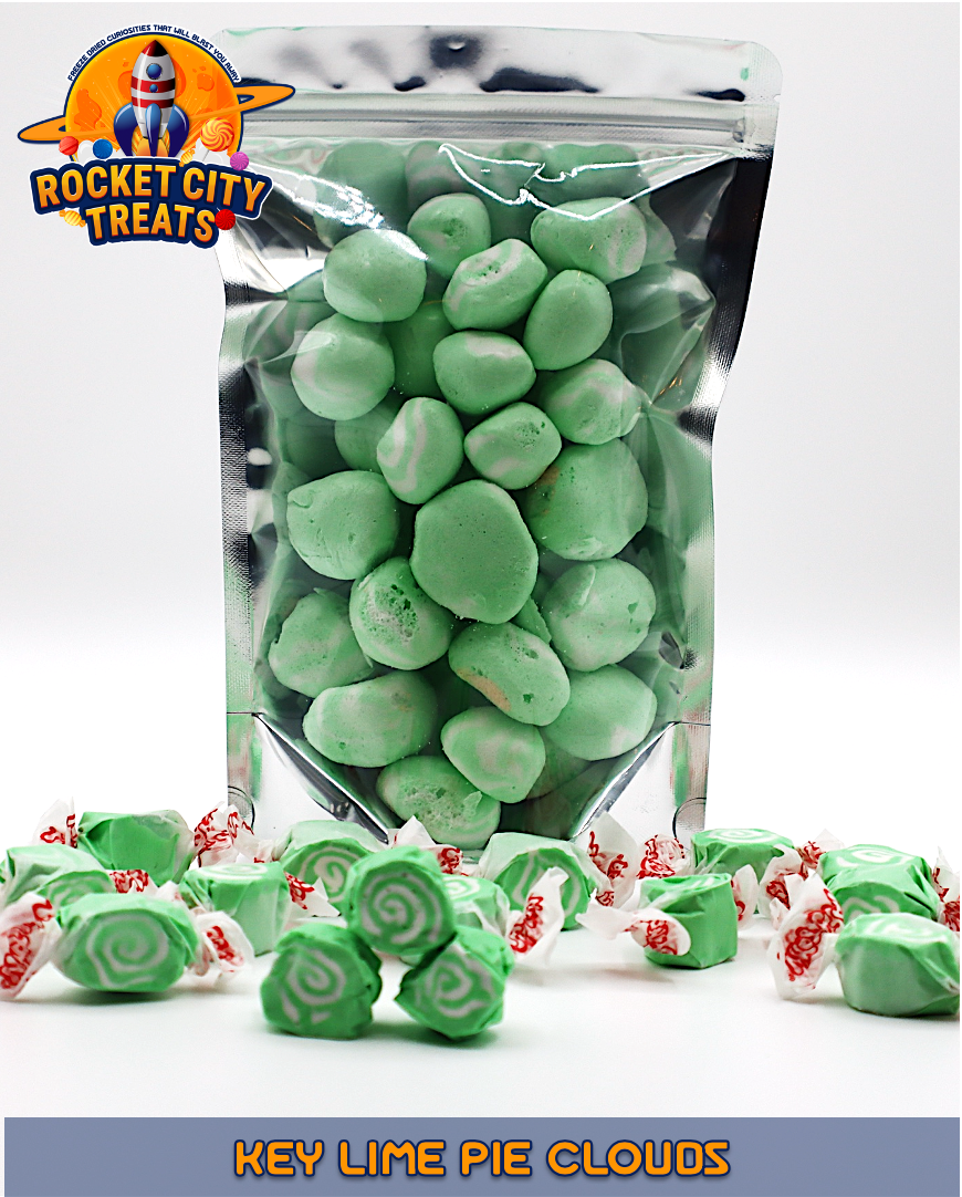Transport your taste buds to a tropical paradise with our Key Lime Pie Clouds! We've magically transformed tangy-sweet key lime salt-water taffy into light, airy morsels through the artistry of freeze-drying.