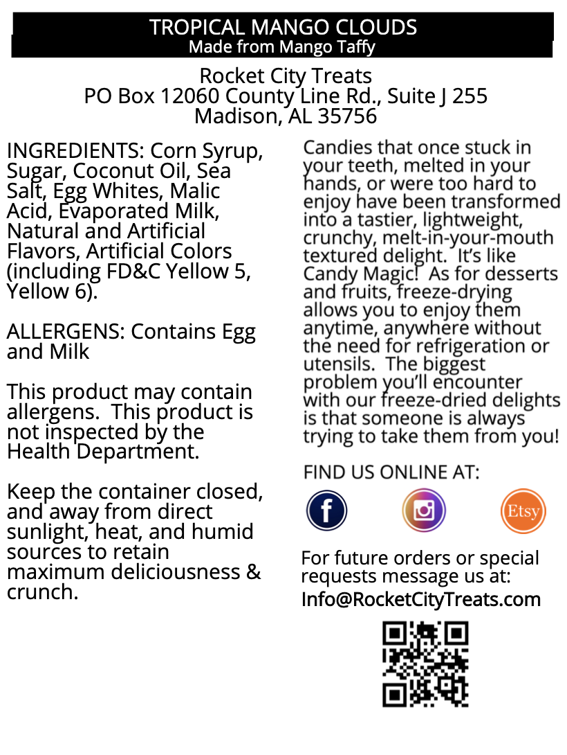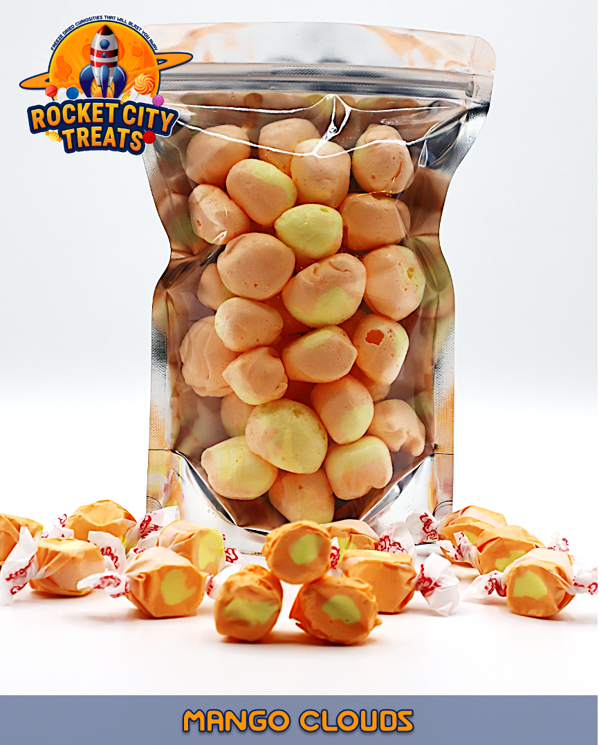 Escape to tropical bliss with our Tropical Mango Clouds! We've transformed luscious mango salt-water taffy into light-as-air delights through the magic of freeze-drying.