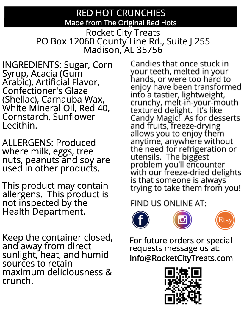 Finally, you can enjoy the blazing cinnamon intensity of Red Hots without dedicating your entire afternoon to the cause! We've taken those fiery little jaw-breakers and freeze-dried them into light, crispy crunchies that deliver maximum heat in minimum time. Each piece explodes with that signature Red Hot burn that makes your eyes water and your taste buds tingle - but now it's over in seconds instead of minutes!